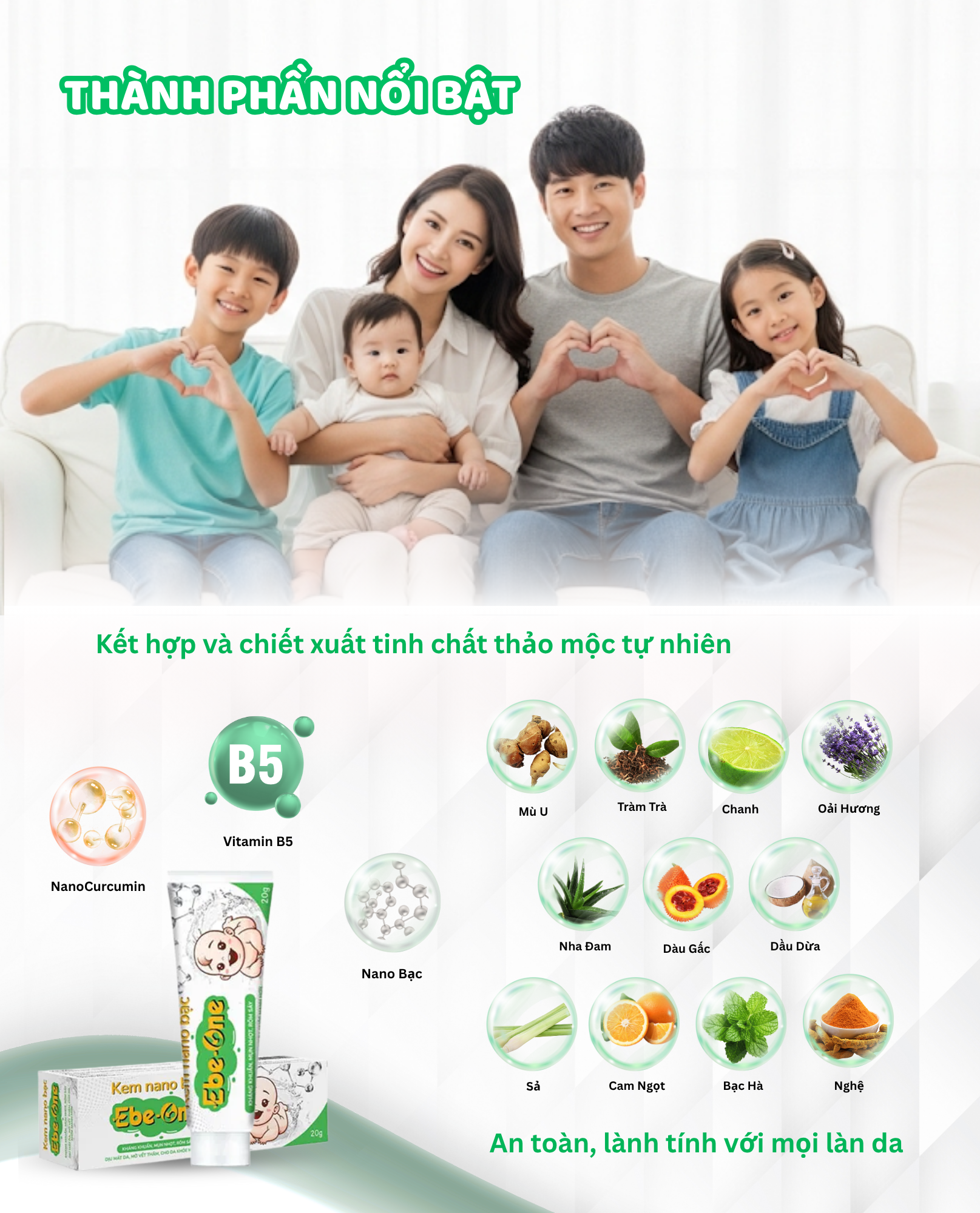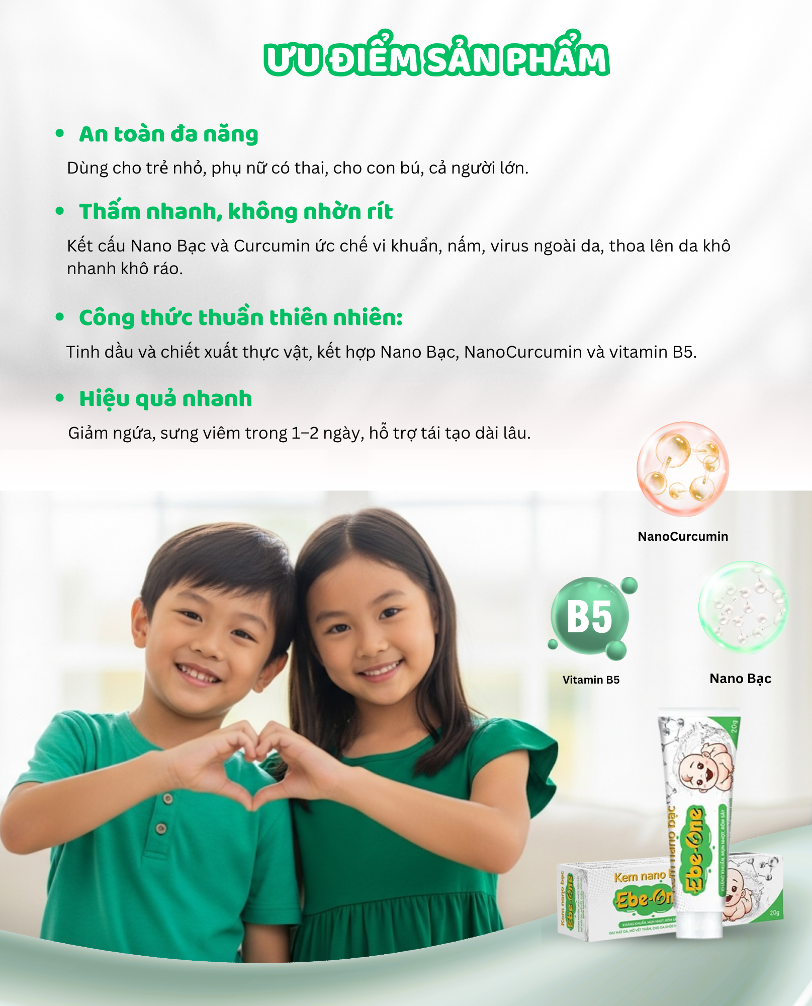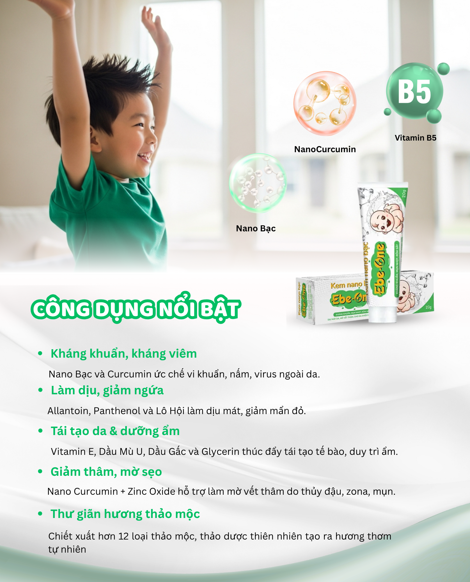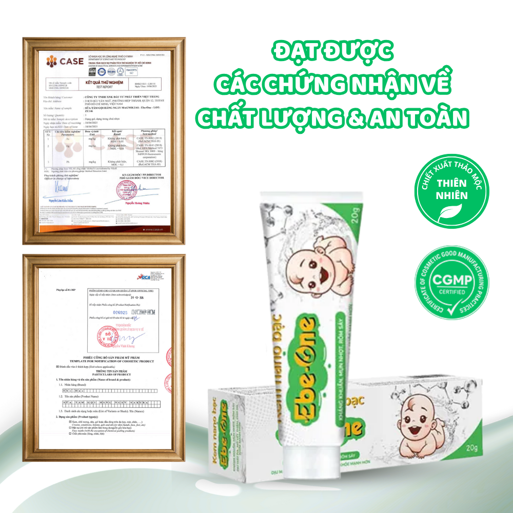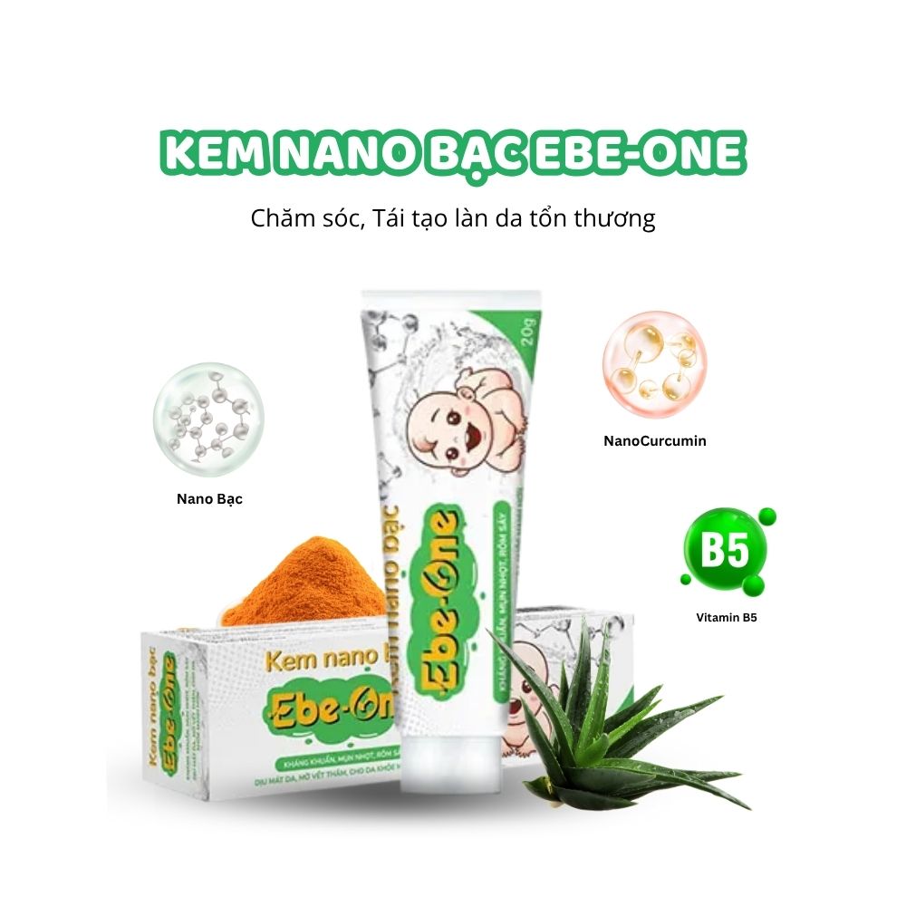 Kem Nano Bạc Ebe‑One là “vị cứu tinh” cho làn da non nớt và nhạy cảm: kết hợp Nano Bạc, Nano Curcumin cùng tinh dầu nghệ, sả chanh, tràm trà… để kháng khuẩn – làm dịu – tái tạo da sau côn trùng cắn, rôm sảy, bỏng nhẹ hay thâm mụn. Công thức lành tính, giàu dưỡng chất thiên nhiên, giúp da bé (và cả mẹ bầu, cho con bú) nhanh chóng khoẻ mạnh, mềm mịn, giảm sẹo và vết thâm.