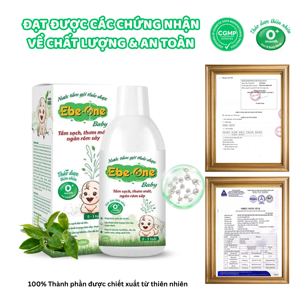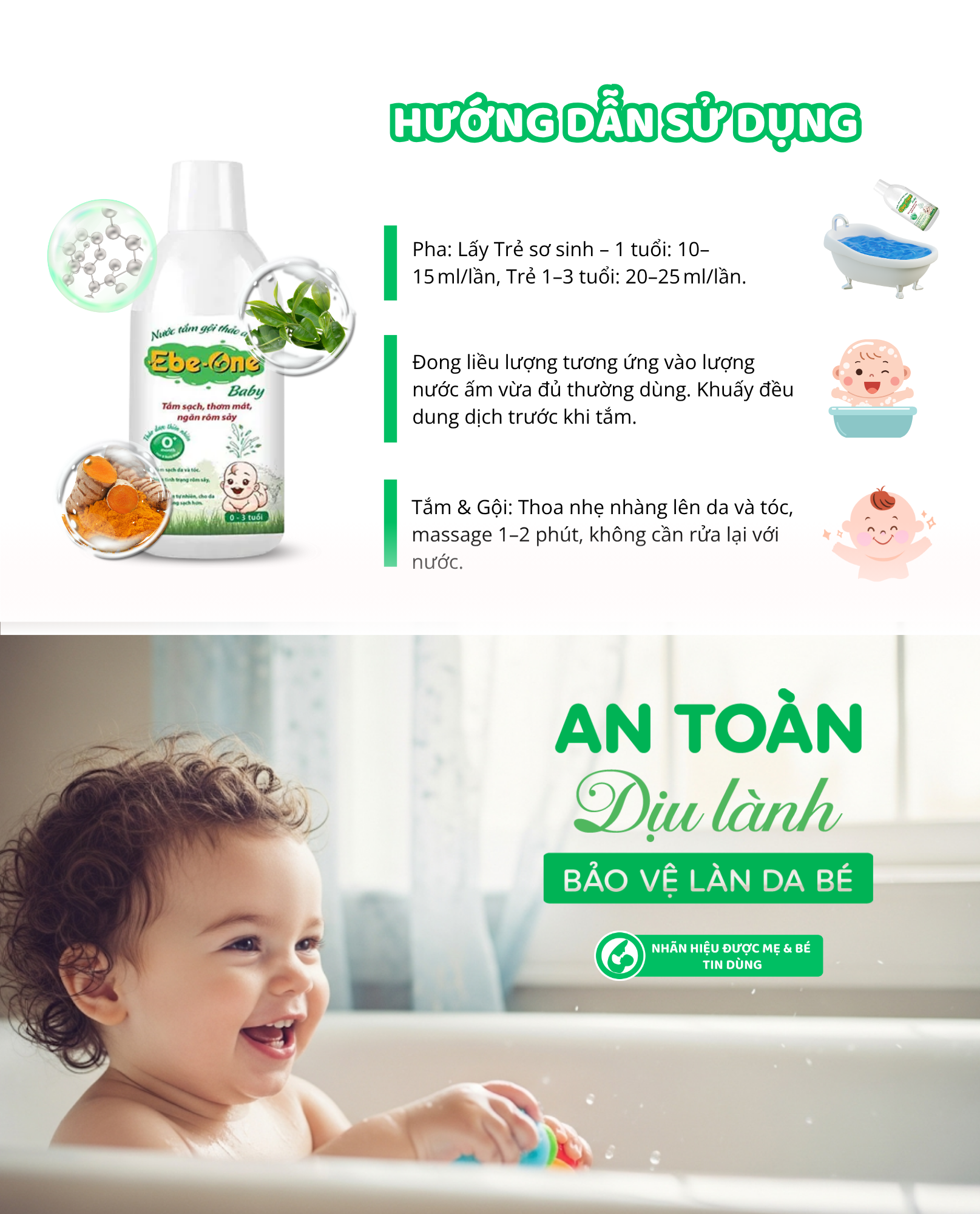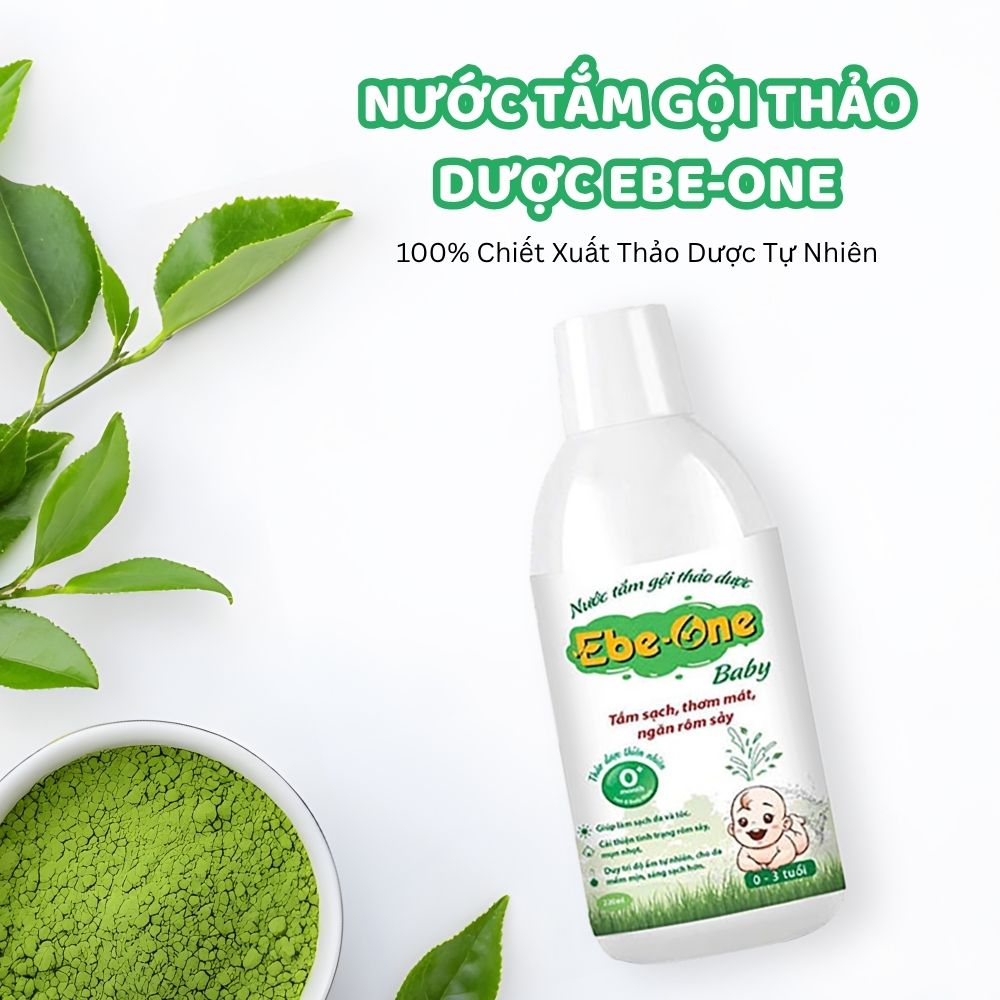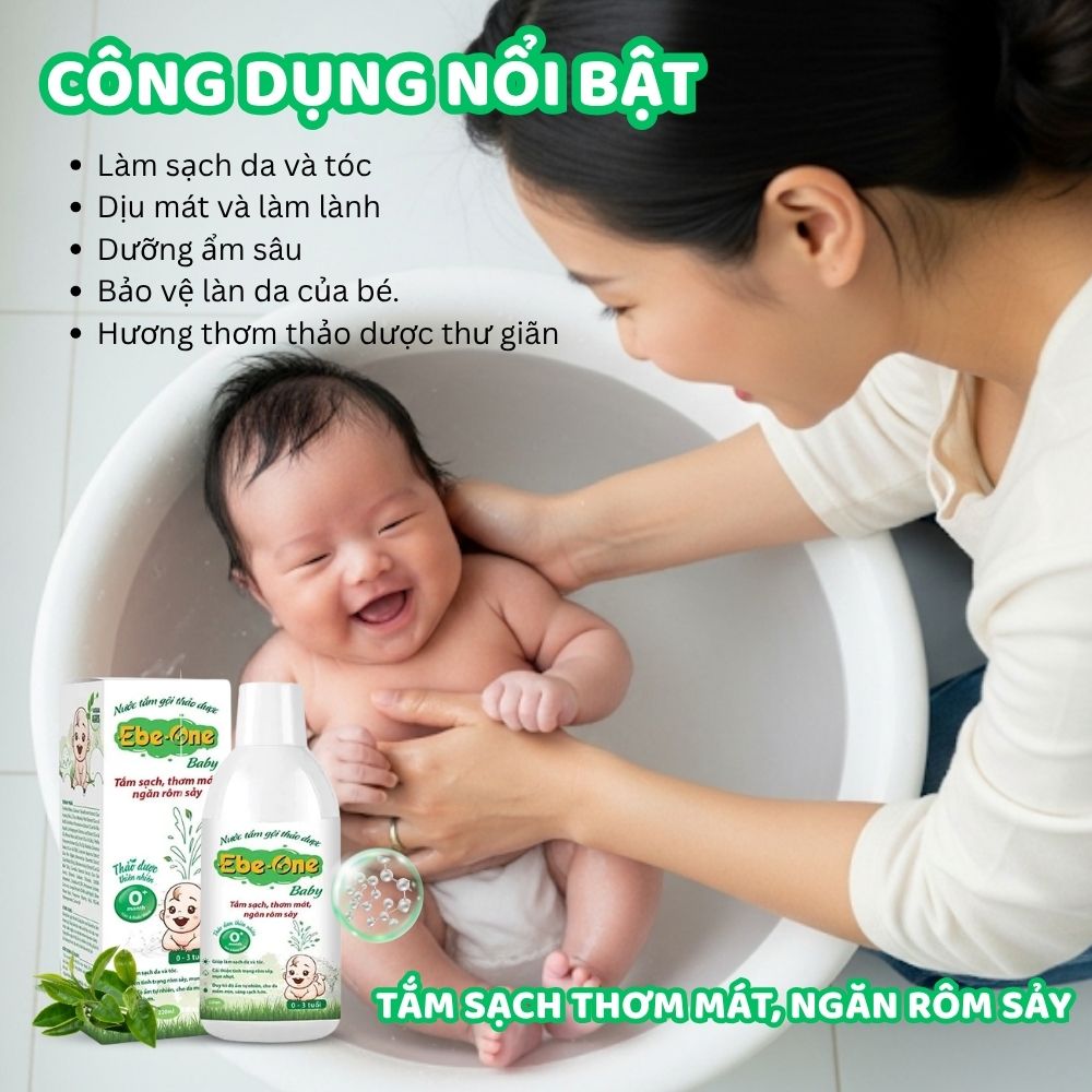 Nước tắm gội thảo dược Ebe‑one “2 trong 1” dành riêng cho bé, thành phần từ 100% dược liệu thiên nhiên kết hợp hơn 10 loại thảo mộc thuần Việt (nghệ, hương nhu, lá bưởi, chè xanh…) và Nano Bạc kháng khuẩn, nhẹ nhàng làm sạch bụi bẩn – mồ hôi mà không làm khô da, đồng thời dịu mát, giảm rôm sảy, mẩn ngứa và cung cấp độ ẩm tự nhiên cho làn da non nớt. Sản phẩm đã được kiểm nghiệm bởi sở y tế, không chứa Paraben hay các thành phần gây hại da, phù hợp cho trẻ sơ sinh, trẻ nhỏ (0–3 tuổi) và cả những làn da khô, nhạy cảm hơn. Với hương thảo mộc dịu êm, mỗi lần tắm là một khoảnh khắc thư giãn, nuôi dưỡng da bé khỏe mạnh và tràn đầy yêu thương