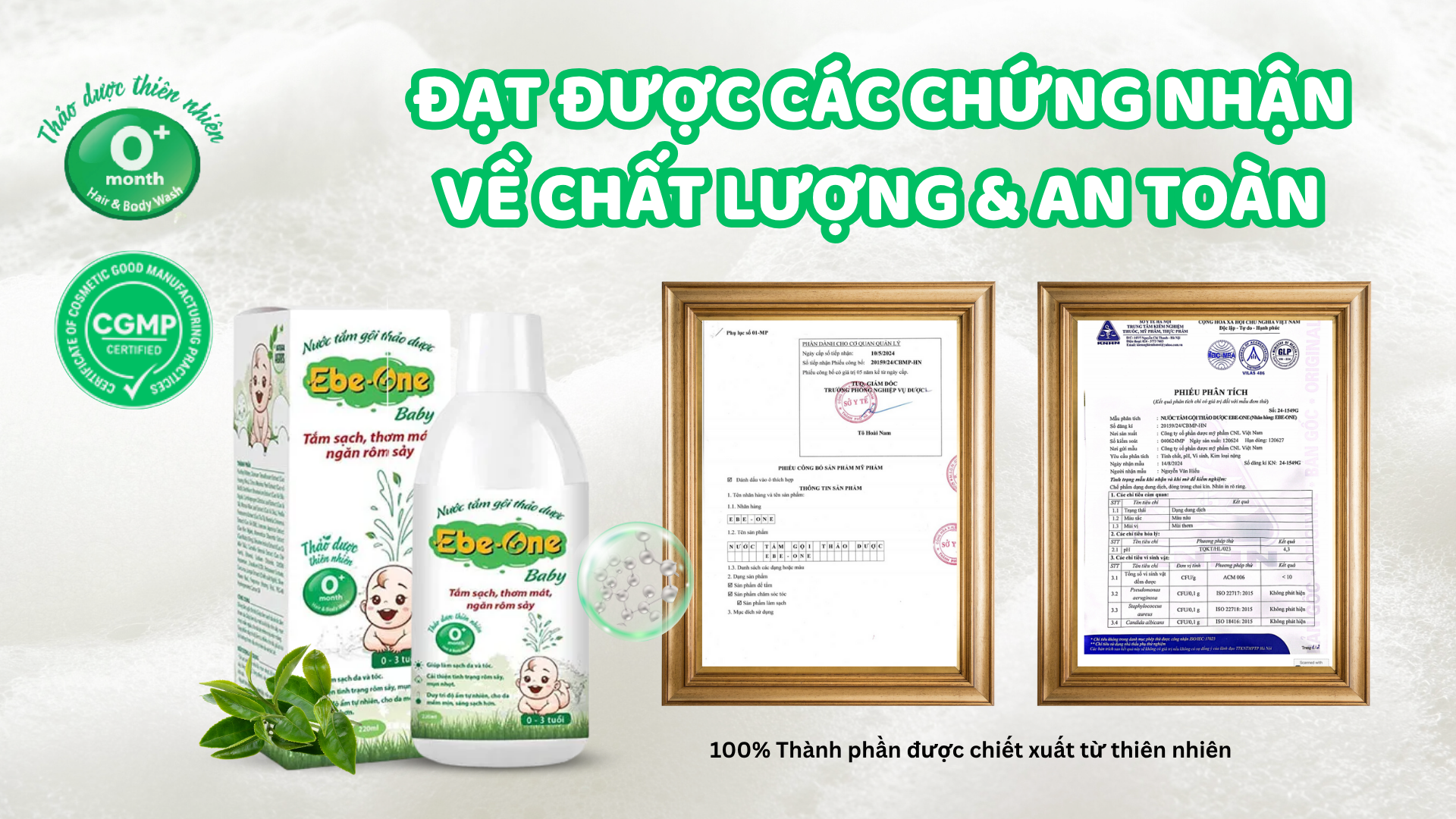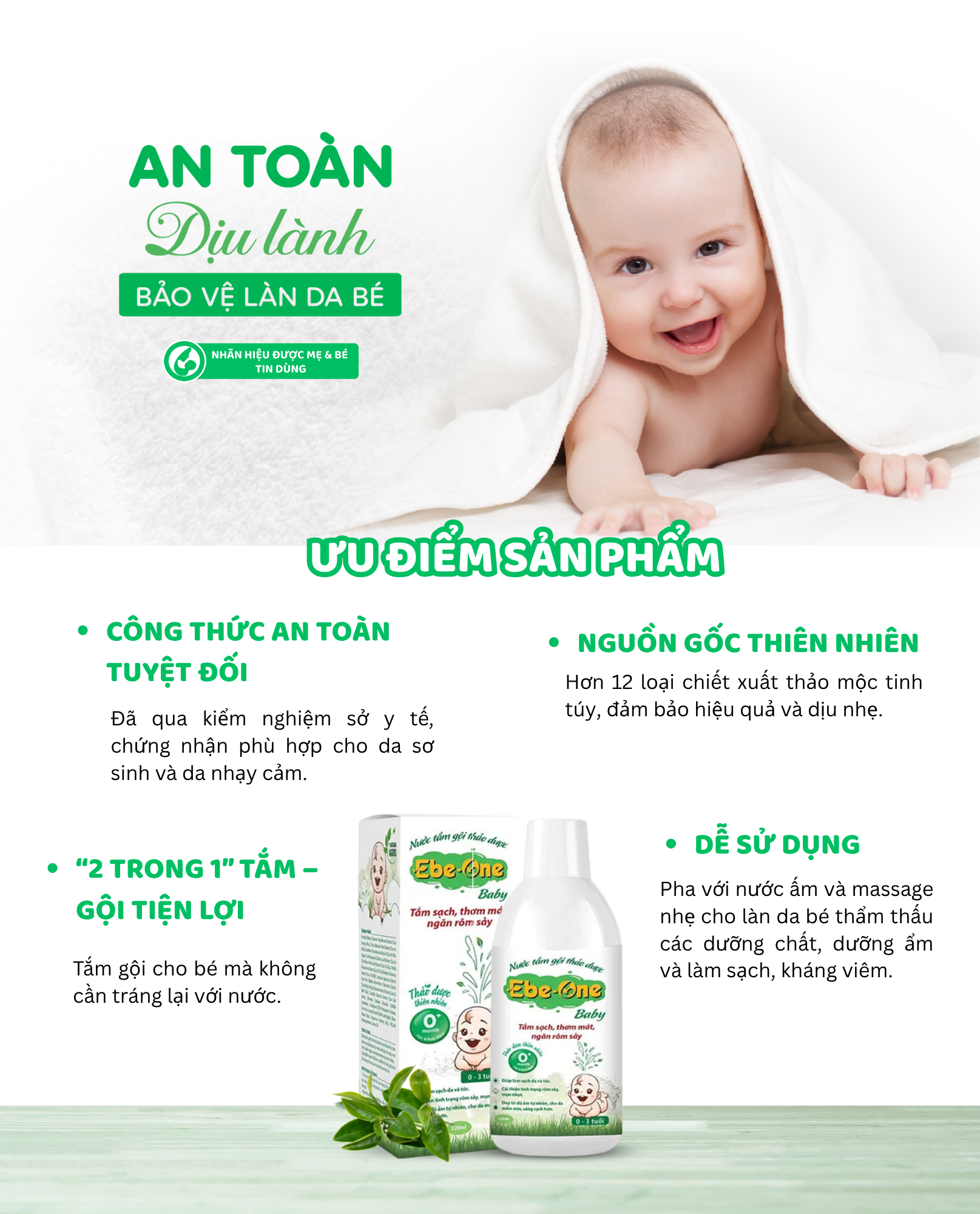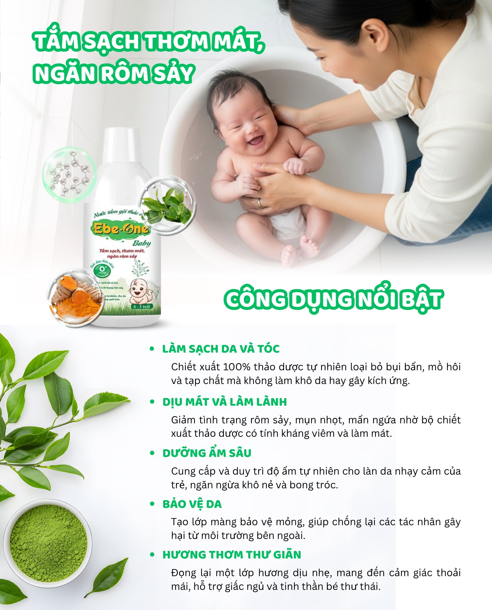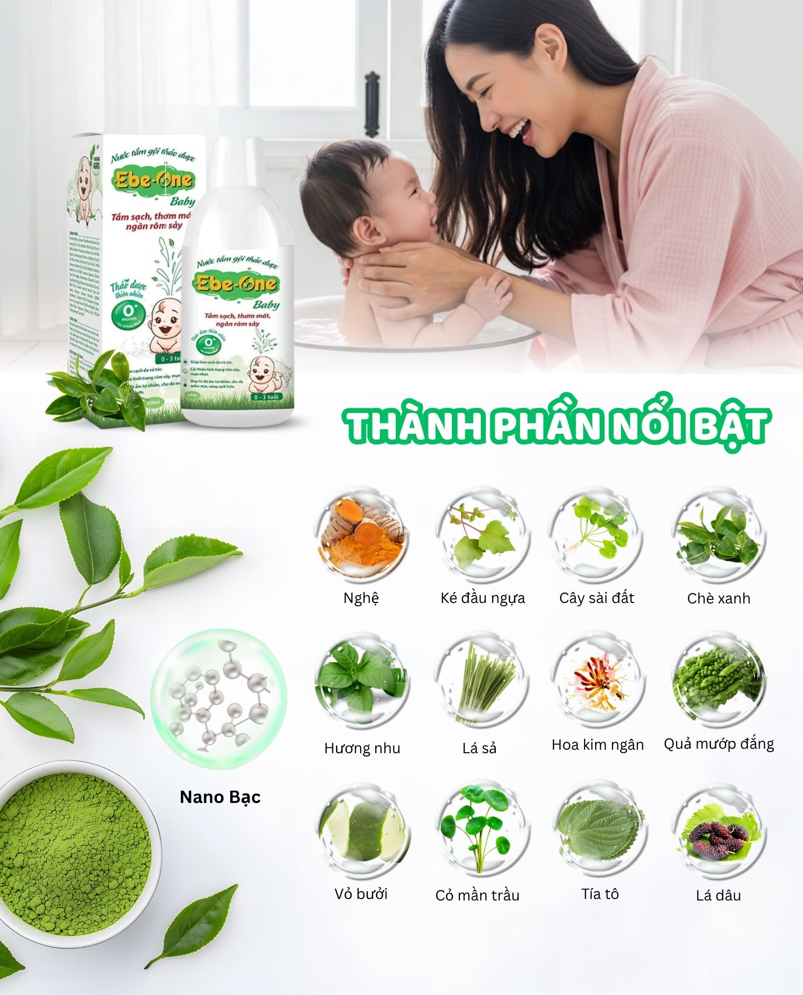 Nước tắm gội thảo dược Ebe‑one “2 trong 1” dành riêng cho bé, thành phần từ 100% dược liệu thiên nhiên kết hợp hơn 10 loại thảo mộc thuần Việt (nghệ, hương nhu, lá bưởi, chè xanh…) và Nano Bạc kháng khuẩn, nhẹ nhàng làm sạch bụi bẩn – mồ hôi mà không làm khô da, đồng thời dịu mát, giảm rôm sảy, mẩn ngứa và cung cấp độ ẩm tự nhiên cho làn da non nớt. Sản phẩm đã được kiểm nghiệm bởi sở y tế, không chứa Paraben hay các thành phần gây hại da, phù hợp cho trẻ sơ sinh, trẻ nhỏ (0–3 tuổi) và cả những làn da khô, nhạy cảm hơn. Với hương thảo mộc dịu êm, mỗi lần tắm là một khoảnh khắc thư giãn, nuôi dưỡng da bé khỏe mạnh và tràn đầy yêu thương