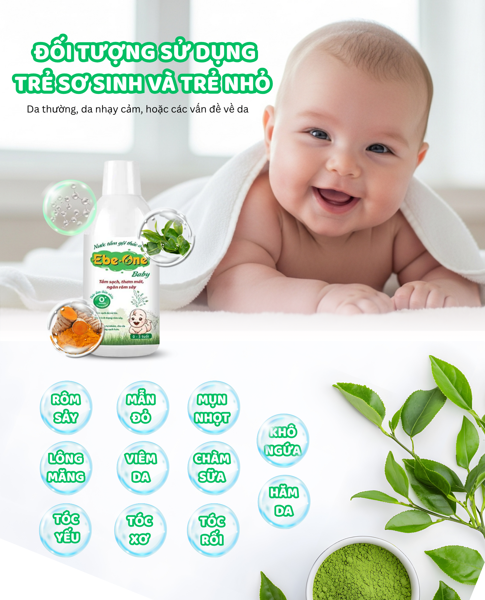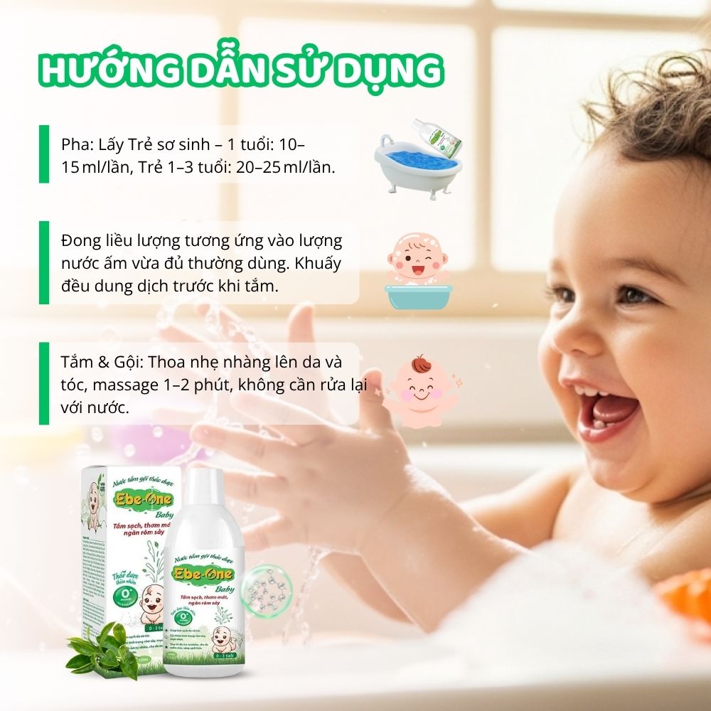 - Tắm Sạch dịu nhẹ: Nước tắm gội thảo dược Ebe-one làm sạch cơ thể, da và tóc của bé một cách nhẹ nhàng, giúp loại bỏ bụi bẩn, mồ hôi và các tạp chất mà không làm khô da hay gây kích ứng.