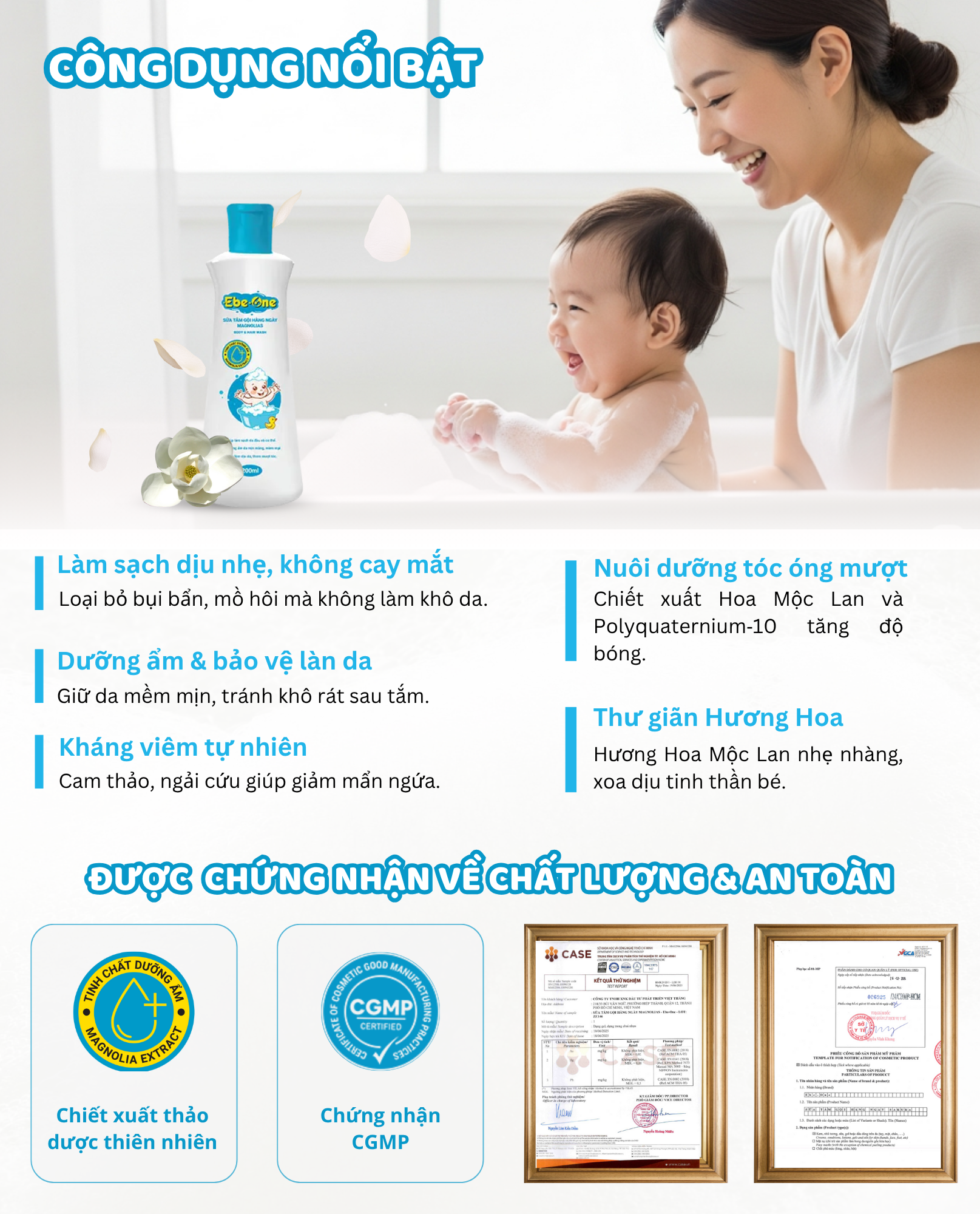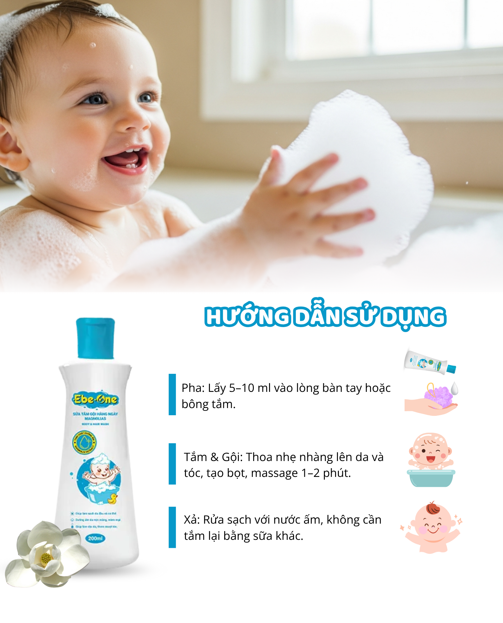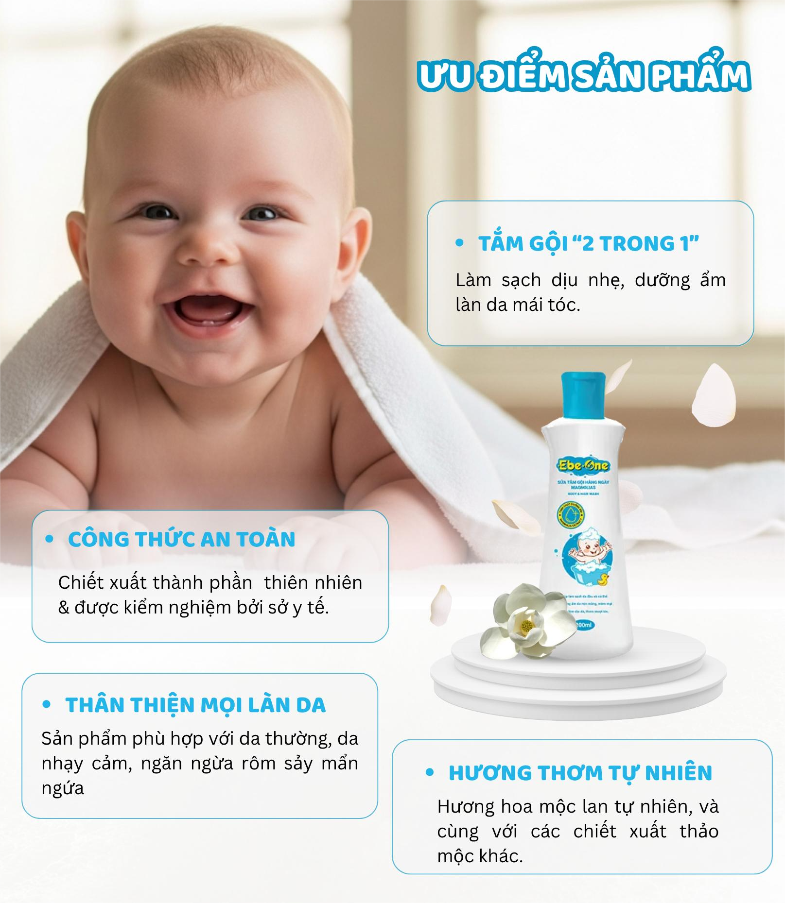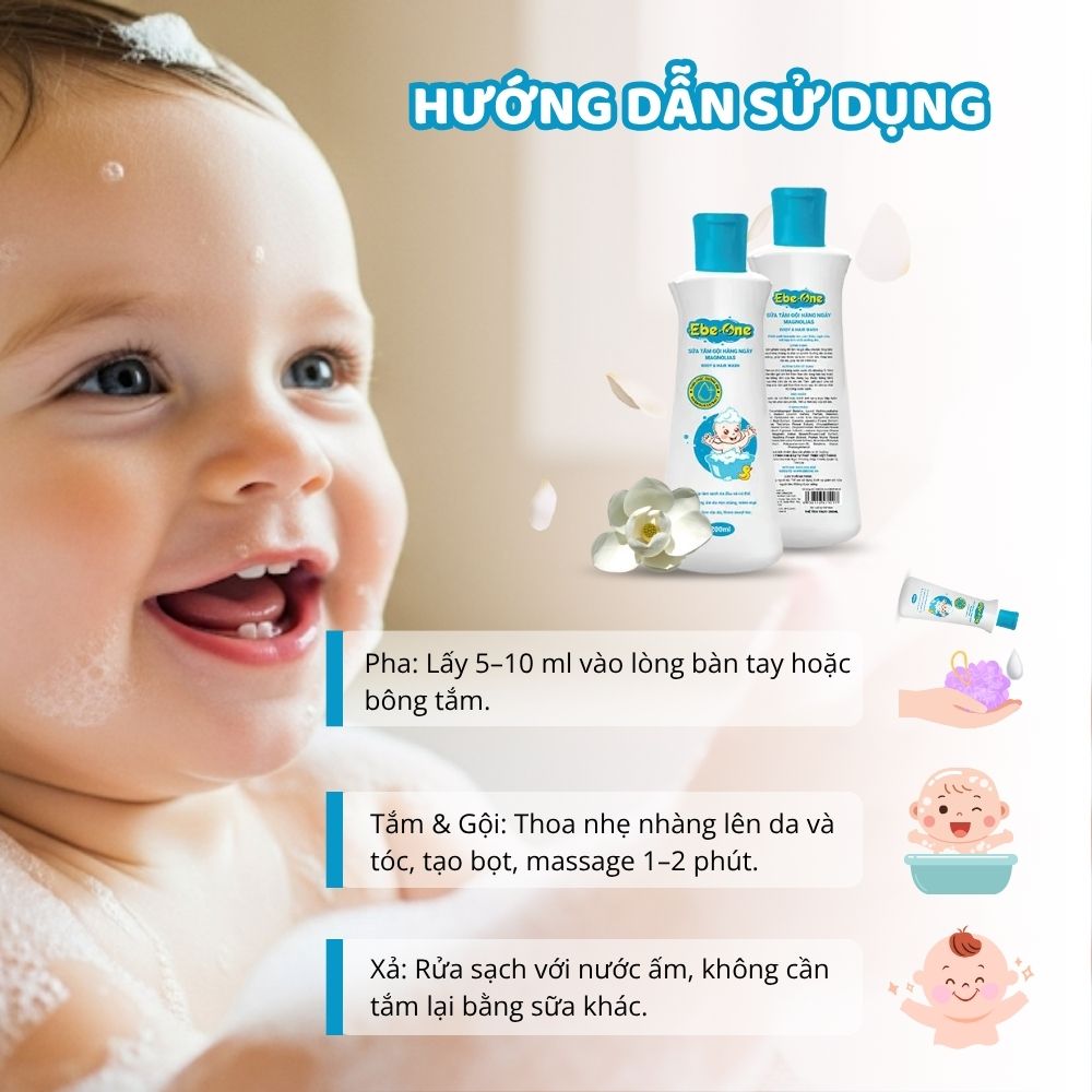 Với những công dụng trên, Ebe-one-Sữa Tắm Gội Hàng Ngày Magnolias là lựa chọn lý tưởng để chăm sóc vệ sinh cho bé mỗi ngày, giúp bé luôn sạch sẽ, khỏe mạnh và dễ chịu.