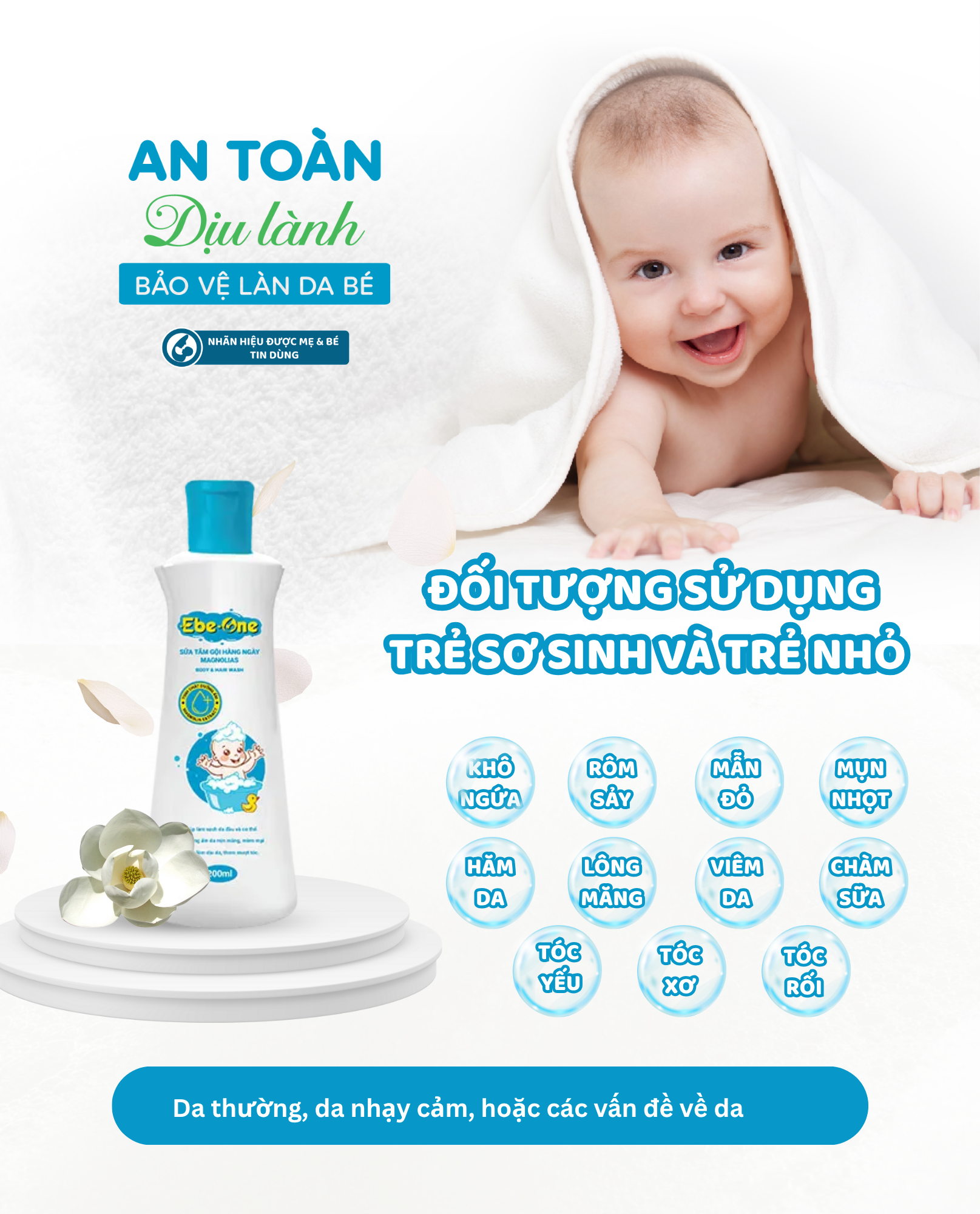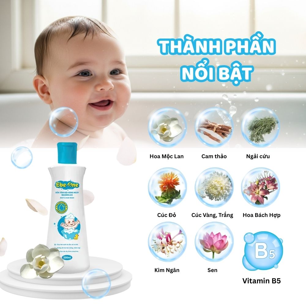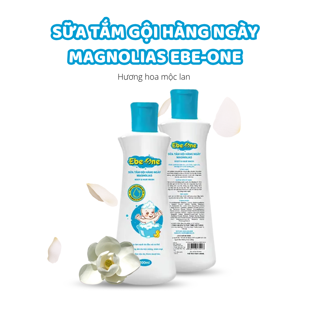 Sữa tắm gội hàng ngày Magnolias Ebe‑One là sản phẩm “2 trong 1” dành cho bé, kết hợp chiết xuất hoa Mộc Lan, cam thảo, ngải cứu và Vitamin B5 với công thức pH cân bằng, không cay mắt. Nhẹ nhàng làm sạch da – tóc, duy trì độ ẩm và nuôi dưỡng mềm mịn, đồng thời mang hương Mộc Lan dịu nhẹ thư giãn, an toàn cho da nhạy cảm của trẻ sơ sinh và trẻ nhỏ.