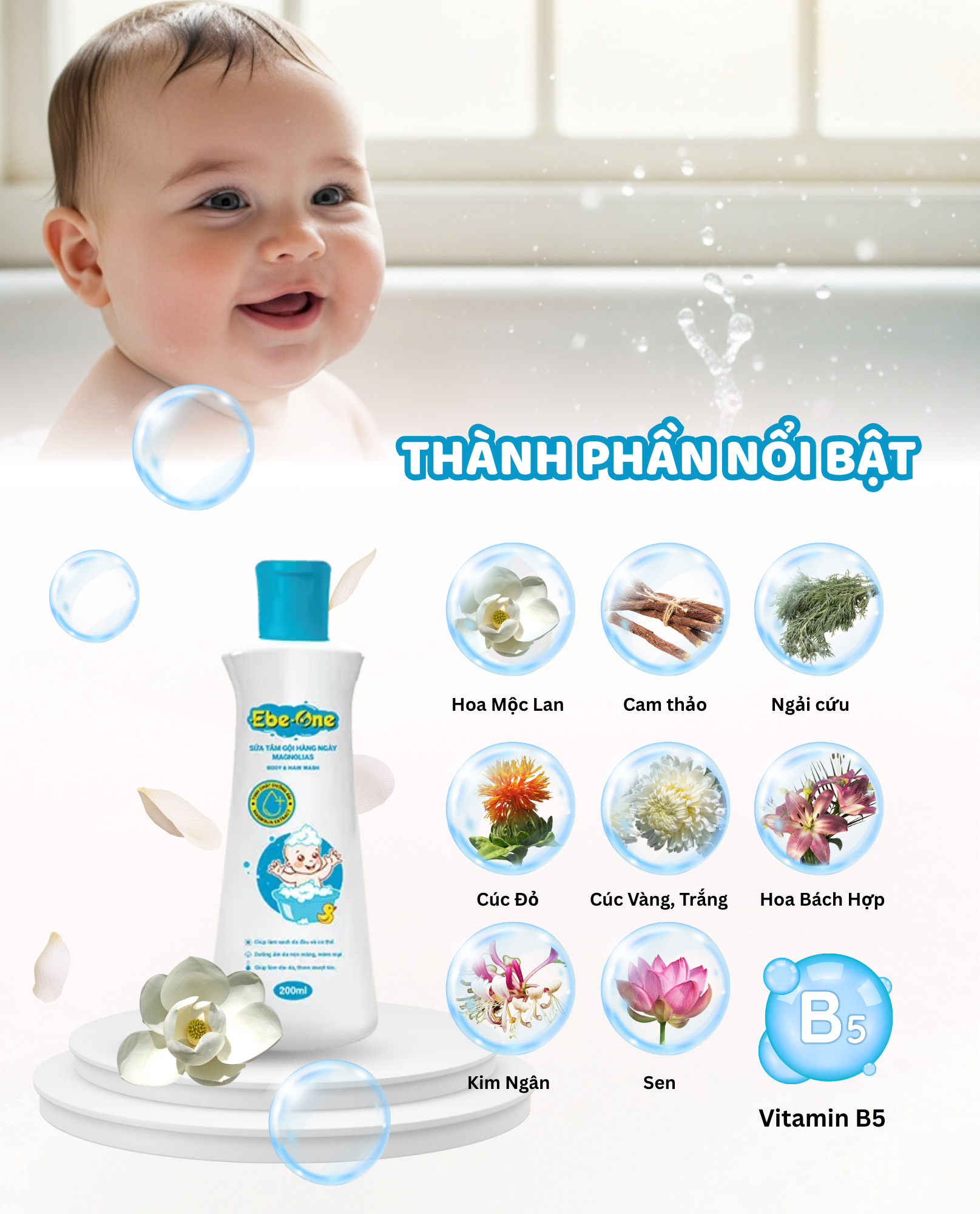 - Chứa thành phần tự nhiên: Ebe-one được chiết xuất từ các thành phần tự nhiên, an toàn cho làn da trẻ em như chiết xuất hoa mộc lan, cam thảo, ngải cứu, Vitamin B5 và các chất làm dịu da, giúp bảo vệ và chăm sóc da một cách tối ưu.